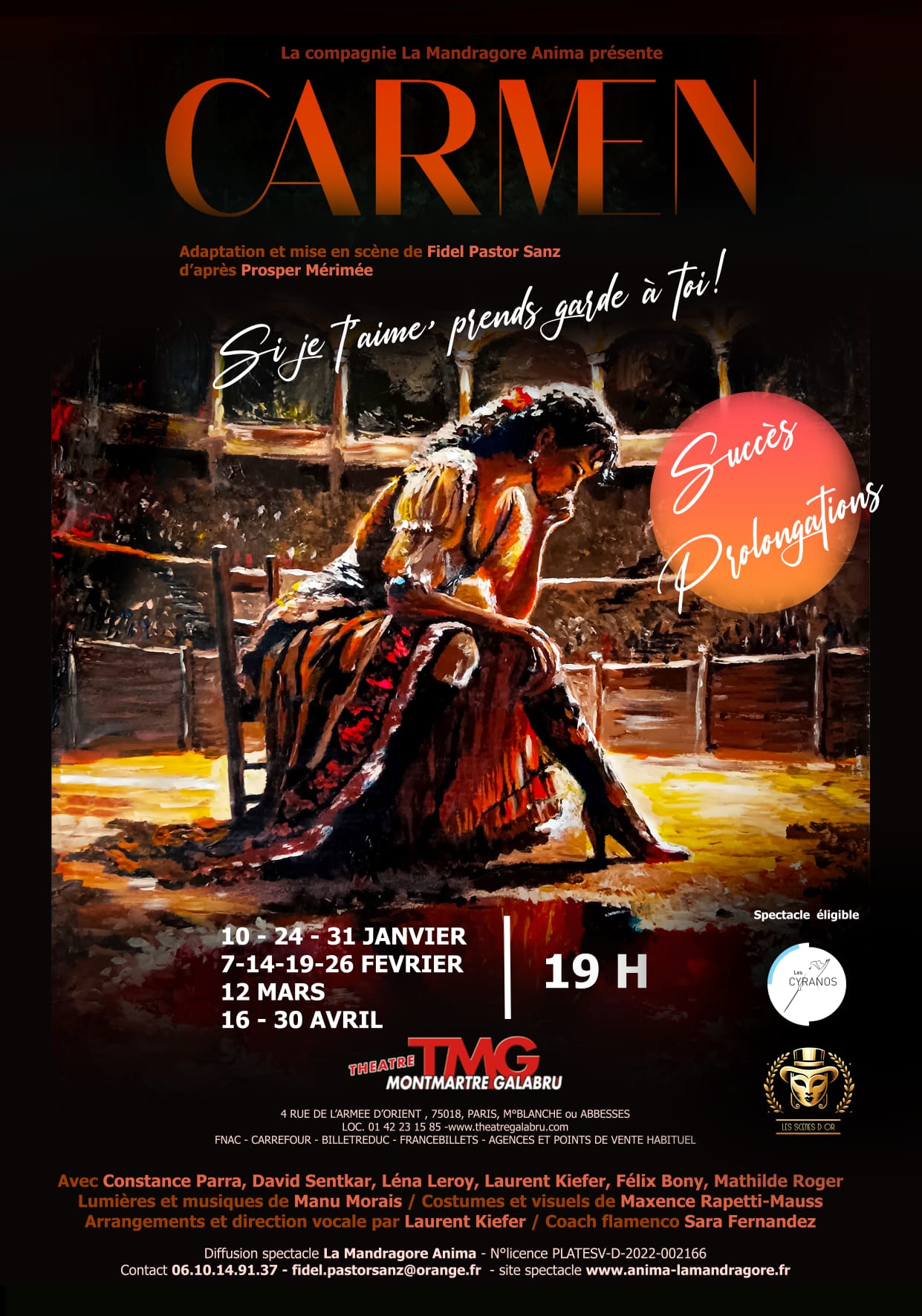 Aux origines du mythe Plus sombre et plus violent que l'opéra de Bizet, le récit de Mérimée s'aventure dans les méandres de l'amour obsessionnel, les ravages de la jalousie et les mystères de l'ésotérisme. On en apprend davantage sur la relation tumultueuse entre Carmen et Don José, et sur la puissance de la fatalité qui scelle le sort des deux personnages. Don José est poussé à tuer des confrères, mentir, et trahir son pays pour cette femme. Il a vendu son âme à sa partenaire et invite celle-ci à faire de même. Une nouvelle figure apparait donc dans le spectacle : une allégorie du destin et du sortilège. Le charme dans tous les sens du terme (ensorcèlement, magie et enchantement) traverse cette version. Carmen est une femme qui lutte pour son indépendance. Cette adaptation reprend les personnages de la nouvelle de Prosper Mérimée comme celui du narrateur à qui José raconte son histoire et ceux créés pour l’opéra de Bizet comme Micaëla, Mercedes et Frasquita. Nous consacrons plus de place aux rôles féminins autres que l’héroïne. Des créations originales D'un fil à l'autre du spectacle, les confrontations les passions et les duels s'enchaînent dans un rythme soutenu, entrecoupés de passages musicaux et de scènes de combats, parfois à l'épée, parfois au corps à corps. Des chants parsèment la pièce, y compris la transposition de quelques airs immanquables de Bizet interprétés par des comédiens et accompagnés par des instruments en live. En parallèle, la bande originale créée spécialement pour le spectacle nous plonge dans l'atmosphère de l'Andalousie. Les costumes ont été intégralement réalisés à la main et sur mesure pour chacun des comédiens, fournis, colorés, et pour la plupart, confectionnés à partir de matériaux chinés et superposés. Générique complet : Mise en scène : Fidel Pastor Sanz Avec : Constance Parra, David Sentkar, Léna Leroy, Laurent Kiefer, Mathilde Roger, Félix Bony Lumières et musique : Manu Morais Costumes et visuels : Maxence Rapetti-Mauss Arrangements et direction vocale : Laurent Kiefer Coaching flamenco : Sara Fernandez Le prix de cession de la pièce est négociable.